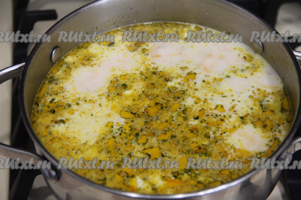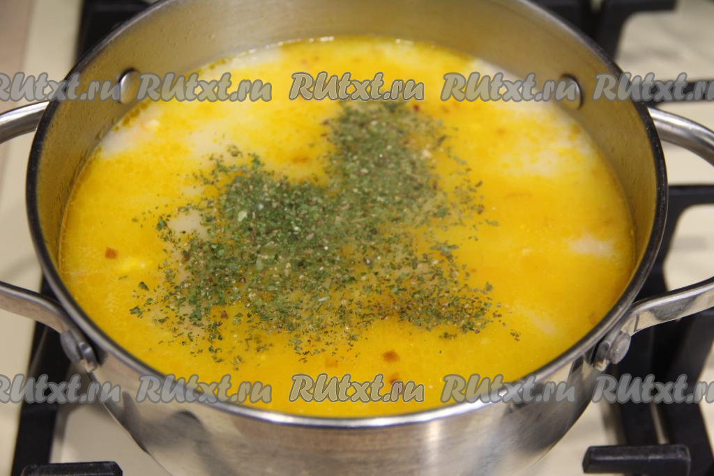 Довести суп до кипения, периодически перемешивая, после этого на небольшом огне проварить 4-5 минут (до полного растворения сыра). Посолить по вкусу, приправить любимыми специями.