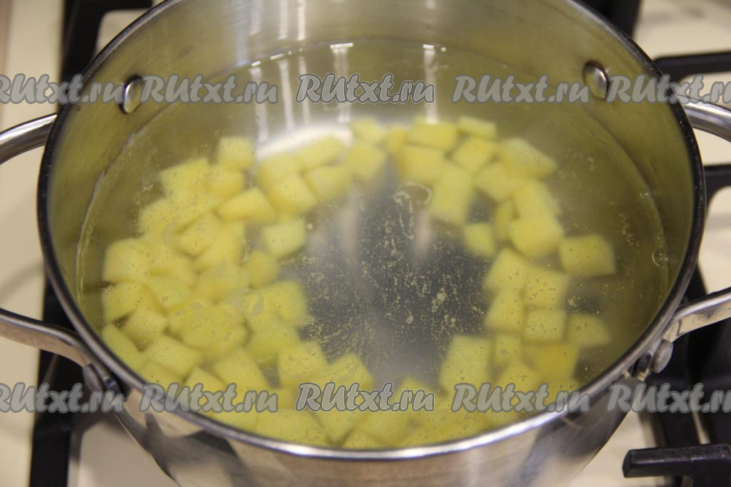 В кастрюлю влить 2 литра воды, сразу поставить на огонь. Картошку почистить, нарезать на средние кубики. В кастрюлю с закипевшей водой выложить картошку, дать закипеть, варить 5 минут на небольшом огне.