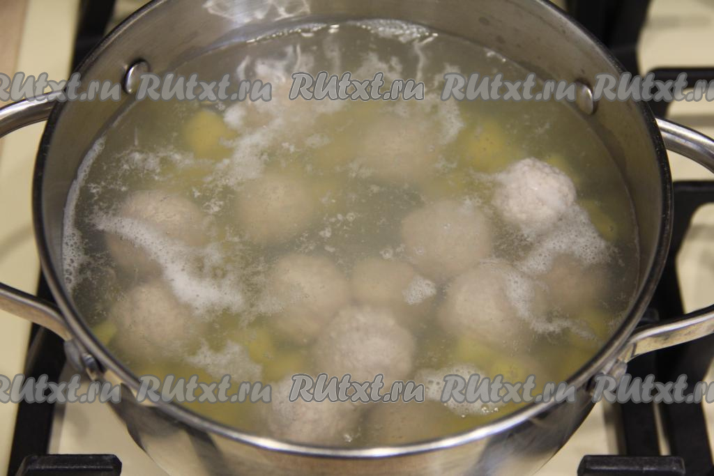 Фарш для формирования фрикаделек можно взять как покупной, так и приготовить его в домашних условиях, пропустив кусочки мяса (у меня - свинина) через мясорубку. Посолить фарш, перемешать, сформировать из него круглые фрикадельки размером с грецкий орех. После того как картофель с момента закипания воды проварится 5 минут, добавить в кастрюлю фрикадельки, дать закипеть, варить суп на небольшом огне 15 минут.