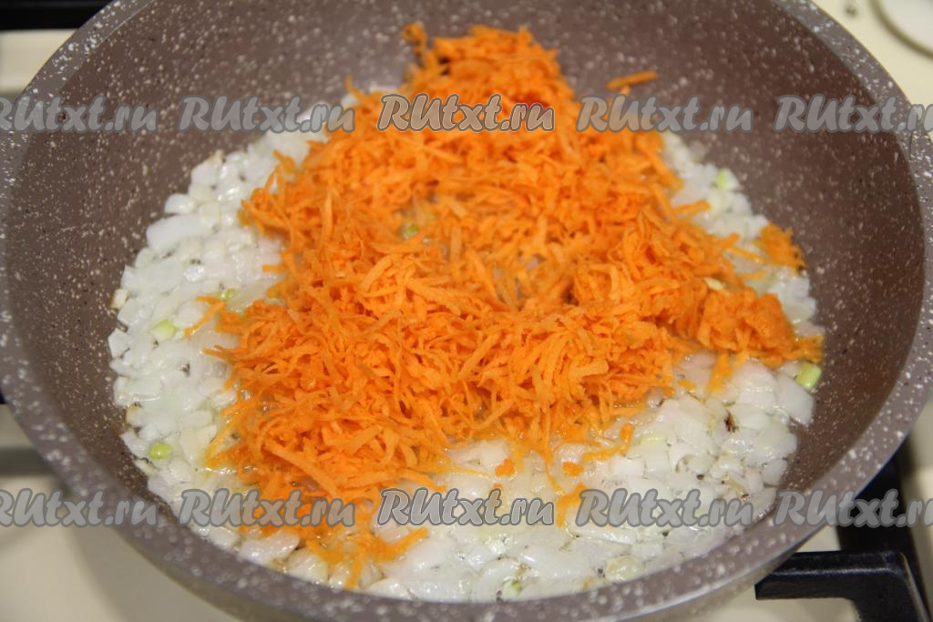 К обжаренному луку добавить очищенную морковку, натёртую на мелкой тёрке, перемешать. Обжаривать овощи минут 5 (до мягкости моркови), время от времени перемешивая. Обжаренные овощи убрать с огня.