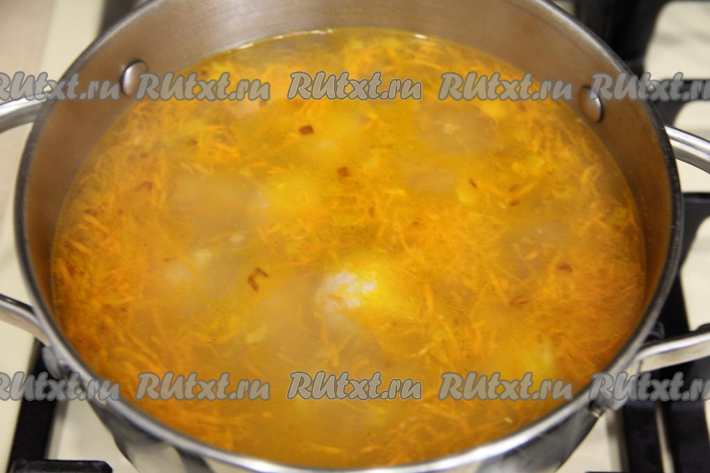 После того как суп с фрикадельками проварится с момента закипания 15 минут, добавить в кастрюлю обжаренные овощи, варить 5 минут. Затем выложить плавленный сыр.