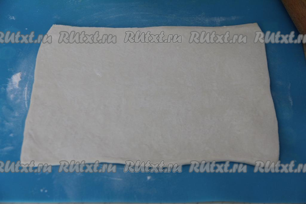 У меня тесто было в двух пластах. Выложить первый размороженный пласт слоёного теста на припылённую мукой поверхность.
