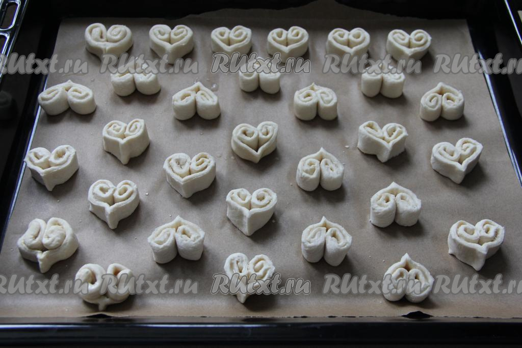 Печенье "Сердечки", посыпанное сахаром, выпекать в разогретой до 220 градусов духовке минут 15 (до золотистости слоёного теста).