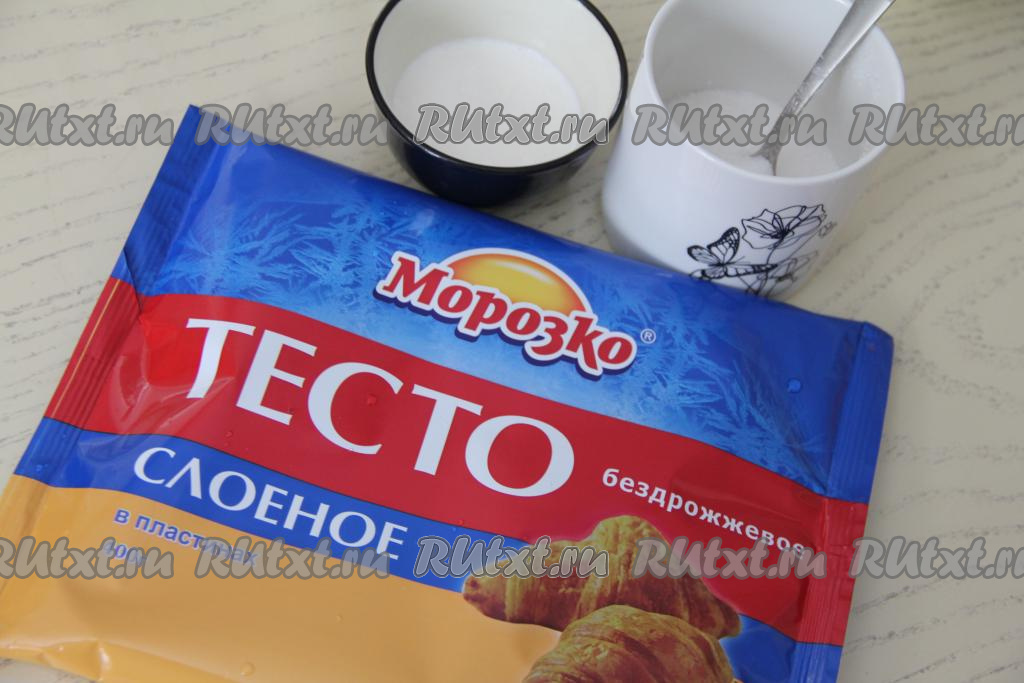 Подготовить продукты. Слоёное тесто можно взять и дрожжевое, и бездрожжевое (у меня - бездрожжевое). Тесто заранее разморозить при комнатной температуре.