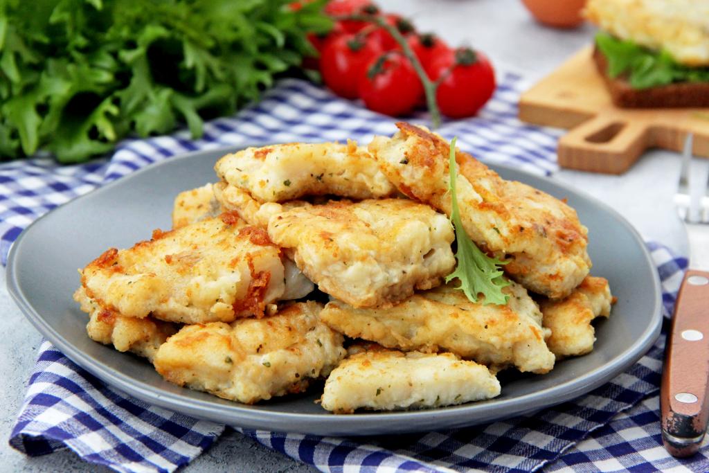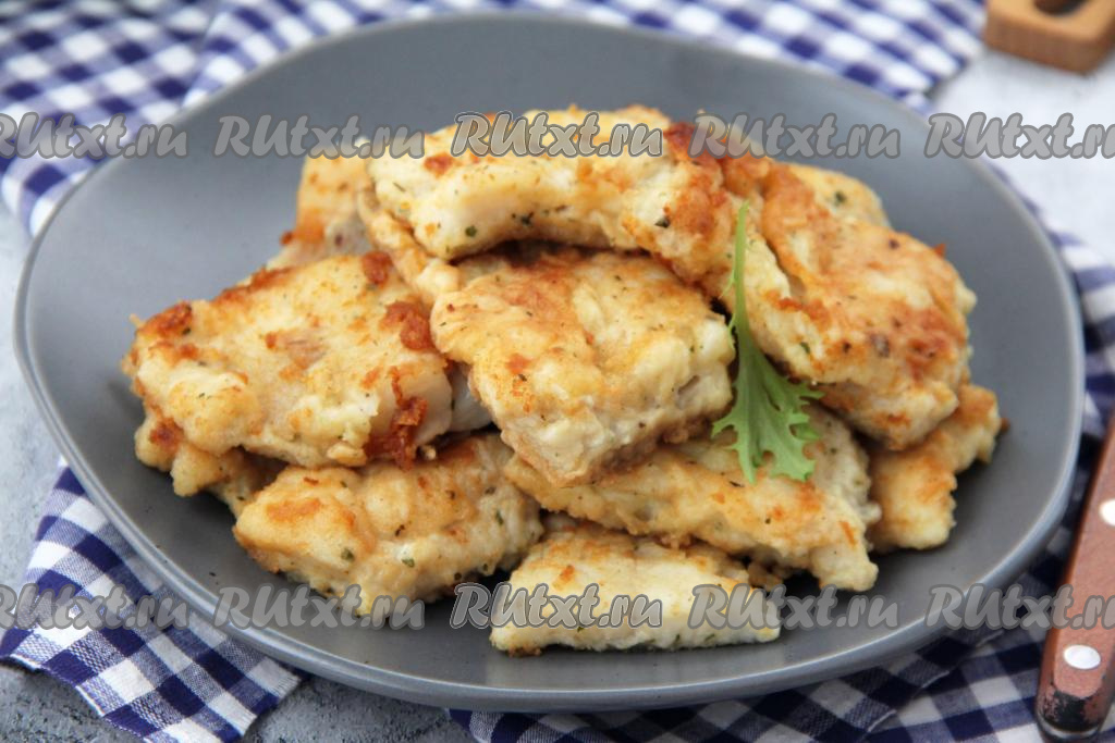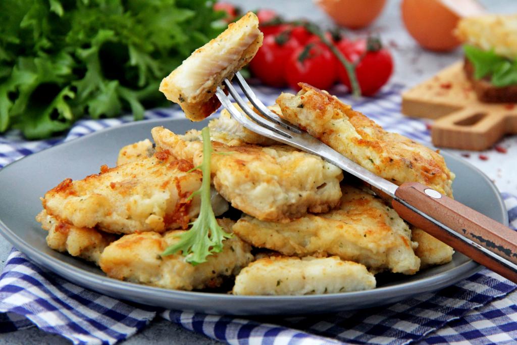 Готовое филе минтая, пожаренное в яйце и муке, подать к столу в горячем виде.