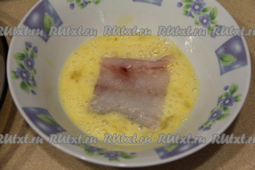 Обмакнуть филе минтая в яйцо с двух сторон.