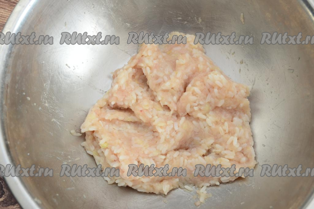 Пока варится рис, приготовим фарш. Для этого куриное мясо нужно промыть водой, обсушить немного и вместе с очищенным луком пропустить через мясорубку, перемешать получившийся фарш.