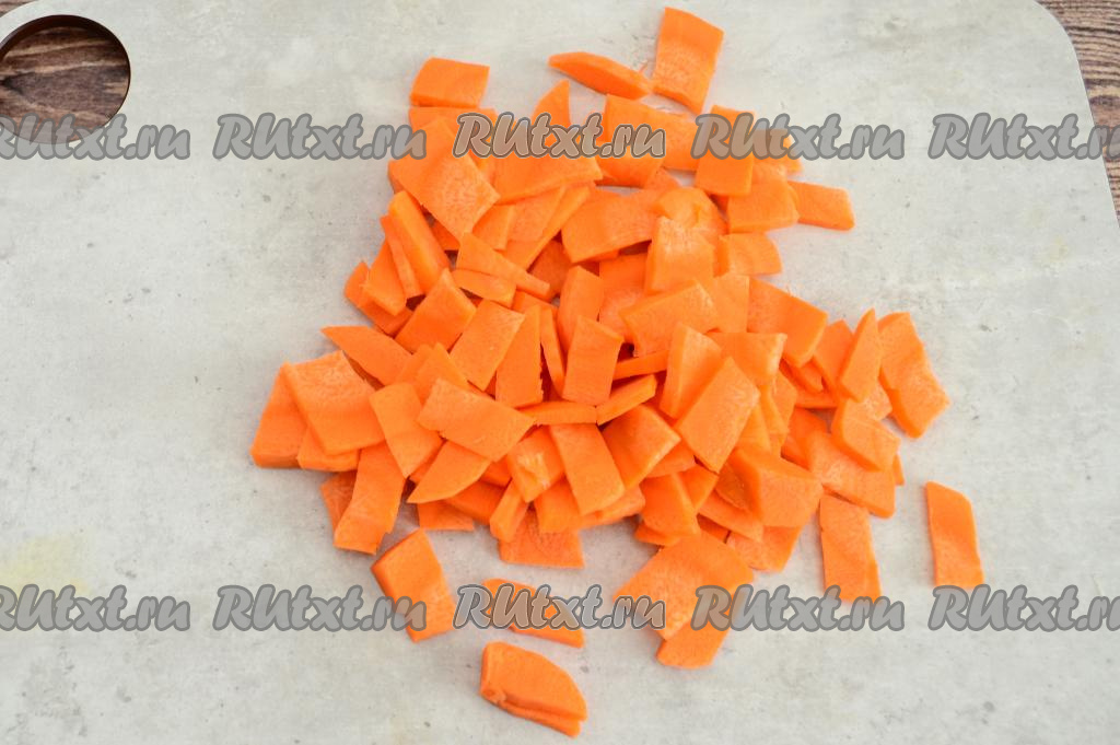 Добавить в кастрюлю очищенную морковку, нарезанную на небольшие брусочки.