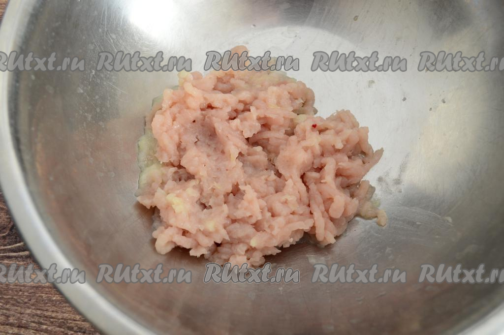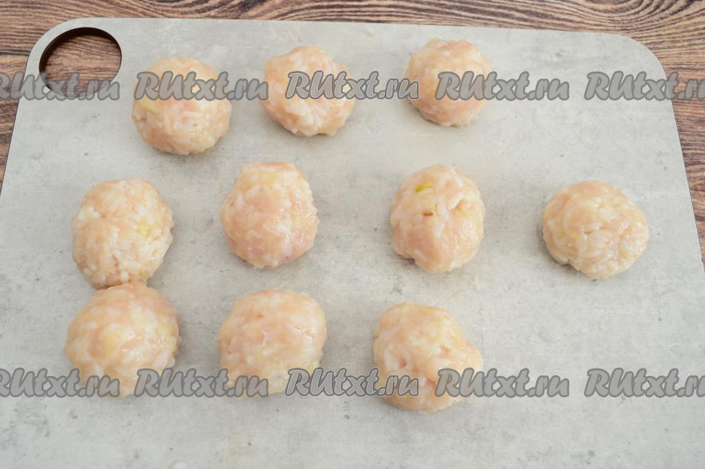 Сформировать из куриного фарша круглые тефтели размером с грецкий орех. Я сформировала 10 тефтелей.