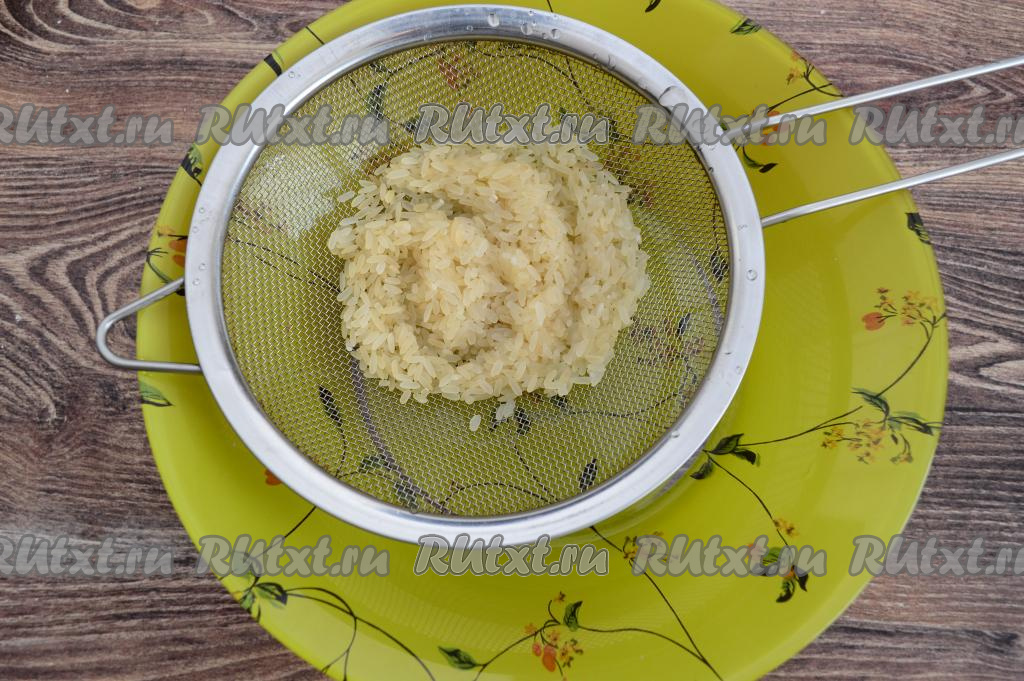 Рис всыпать в сито, промыть под проточной водой. В кастрюле вскипятить 250 миллилитров воды, выложить подготовленный рис, перемешать, дать закипеть, уменьшить огонь и варить минут 20 (до мягкости риса). Сварившийся рис откинуть на сито, промыть холодной водой, чтобы он быстрее остыл, затем оставить в сите на 2-3 минуты, чтобы стекла лишняя жидкость.