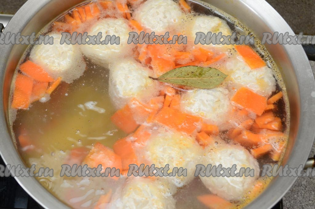 Дать ещё раз супу с тефтелями закипеть, уменьшить огонь и варить минут 20 (морковь и картошка должны стать достаточно мягкими и легко прокалываться вилкой).
