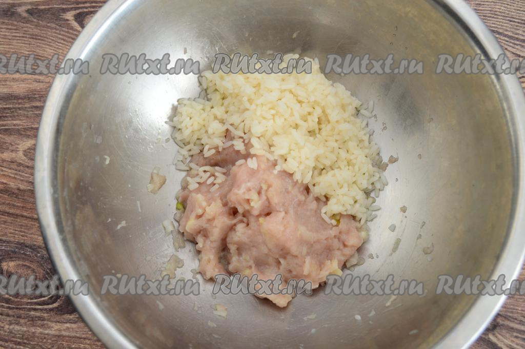 К получившемуся фаршу добавить остывший рис.
