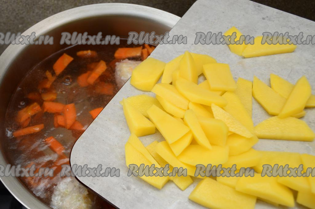 Следом в кастрюлю отправить картошку, нарезанную на небольшие брусочки, добавить лавровый лист, посолить по вкусу.