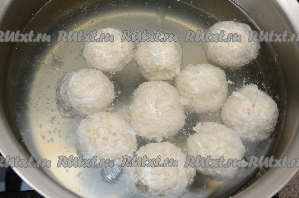 В кастрюлю влить 2 литра воды, выложить куриные тефтели, поставить на достаточно сильный огонь, после закипания воды убрать с поверхности пену, уменьшить огонь.