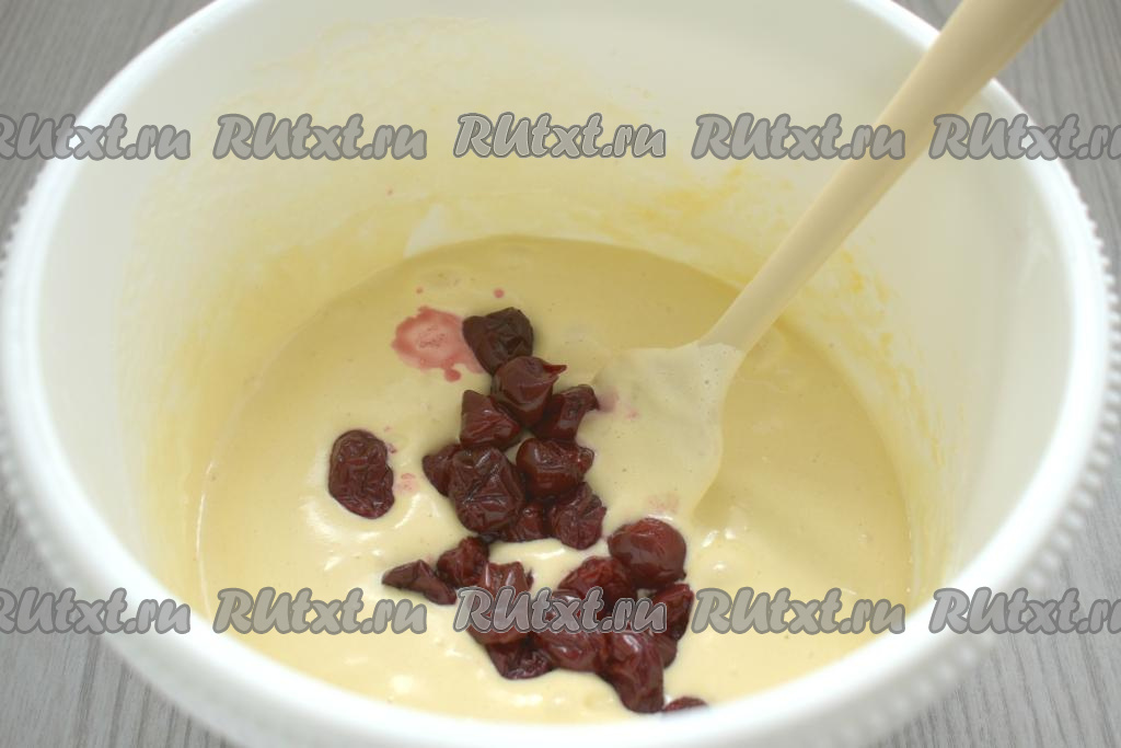 Подготовленную вишню перекладываем в тесто, аккуратно перемешиваем, равномерно распределяя ягоды по всему тесту.