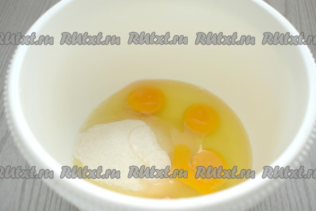 Взбиваем яйца с сахаром на максимальных оборотах миксера в течение 4-5 минут. Яичная масса увеличится в объёме и посветлеет в процессе взбивания.