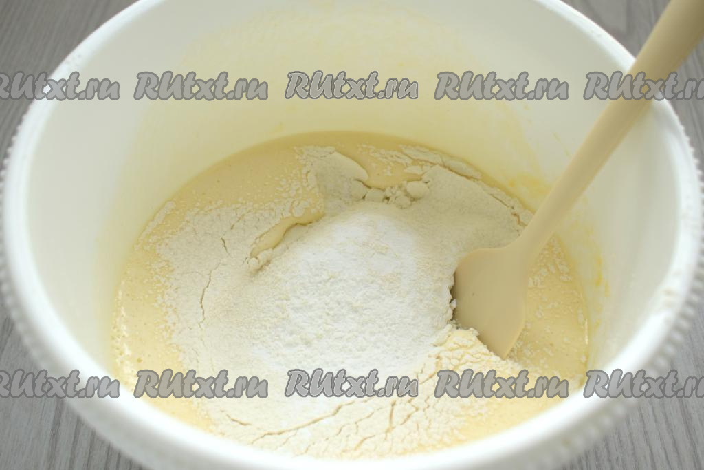 В получившуюся массу всыпаем разрыхлитель и 100 грамм просеянной муки, перемешиваем тесто для шарлотки лопаткой (или столовой ложкой), полностью вмешивая муку и при этом стараясь не сбить воздушность взбитых яиц.