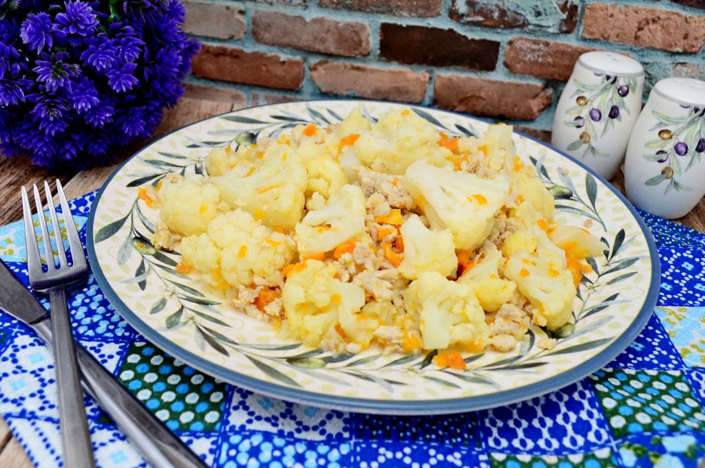Нежную цветную капусту вместе с сочным фаршем разложить со сковороды по тарелкам и в горячем виде подать аппетитное, вкусное блюдо к столу.
