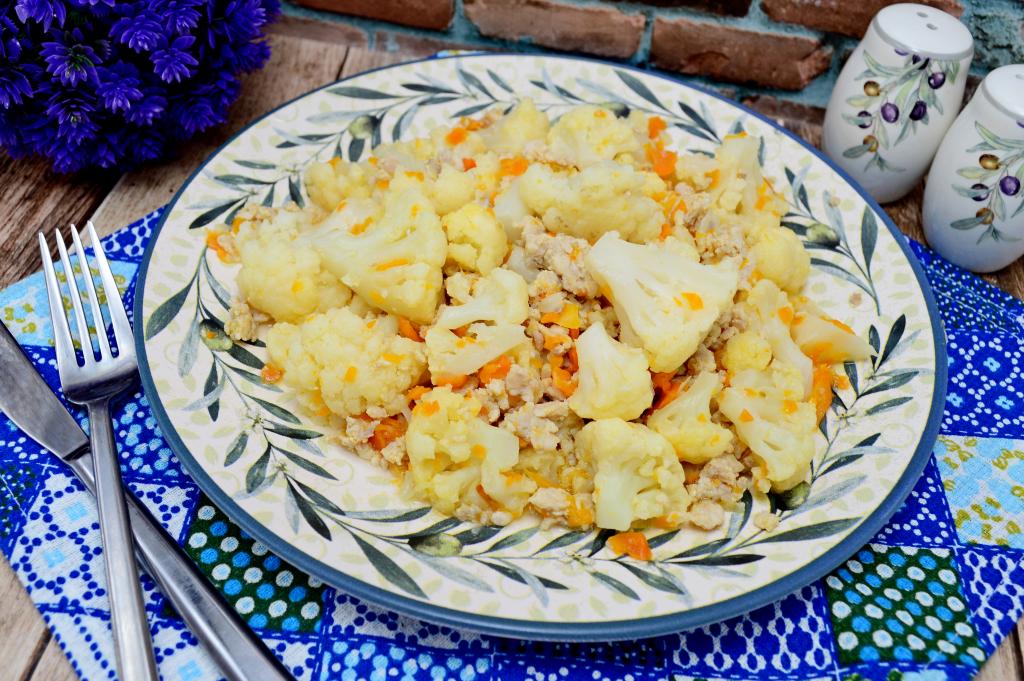 Цветную капусту можно купить практически круглый год. Поэтому я достаточно часто готовлю различные блюда из неё. В этот раз решила поделиться рецептом приготовления цветной капусты с фаршем на сковороде. Блюдо получается сочным, вкусным, аппетитным и достаточно сытным, его можно подать к столу в качестве полноценного обеда или ужина. Фарш можно взять любой (например, из курицы, свинины, индейки или смешанный). Цветная капуста получается нежной, мягкой, она отлично сочетается с сочным фаршем, морковка делает блюдо более ярким. Просто и вкусно, попробуйте!