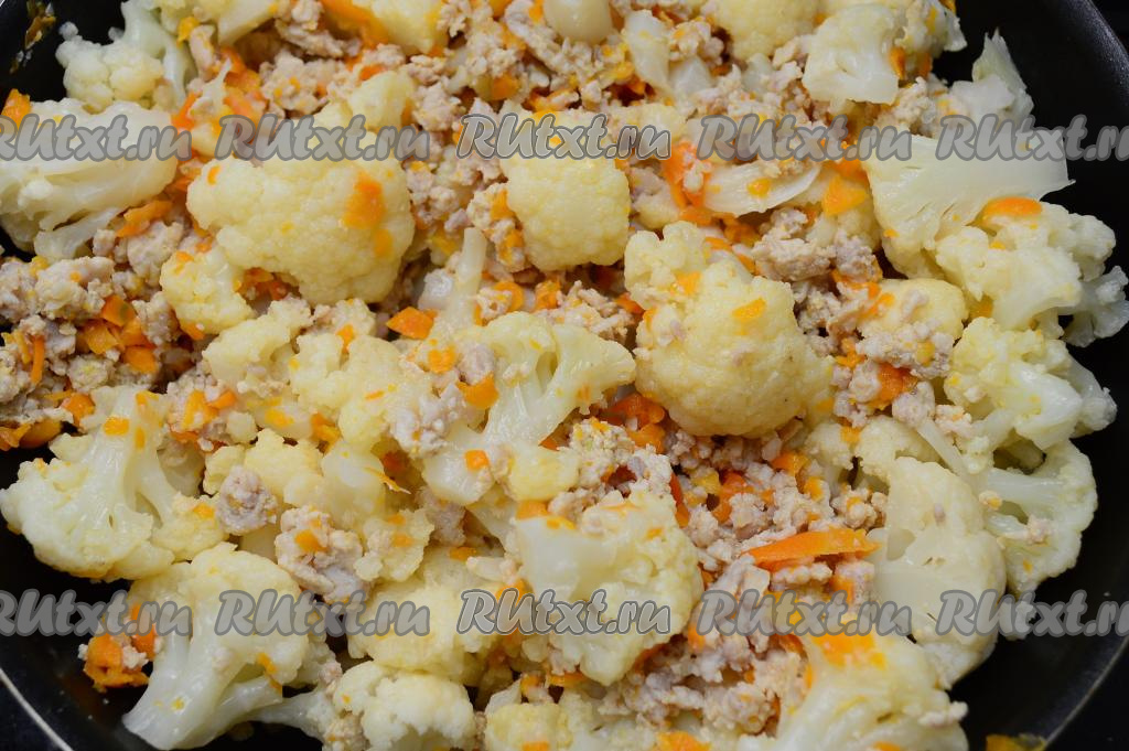 Добавить соцветия капусты в сковороду с протушившимся фаршем, перемешать, прогреть блюдо в течение 3-4 минут, периодически перемешивая, убрать с огня.