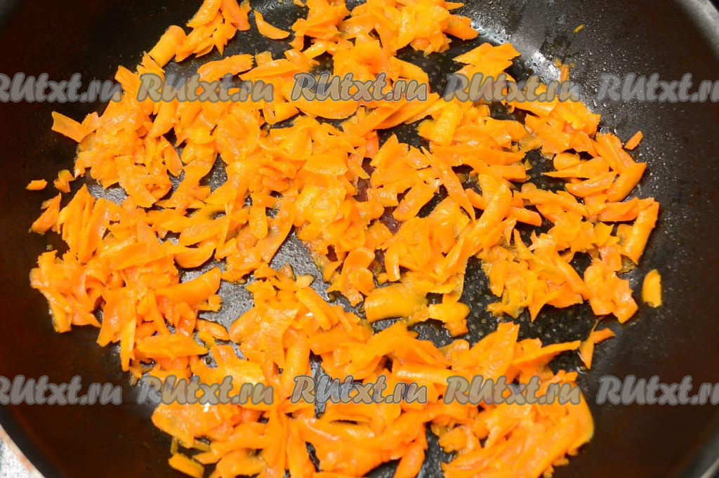 В сковороду влить растительное масло, хорошо его разогреть, выложить натёртую на крупной тёрке морковь. Обжарить морковку на среднем огне, иногда помешивая, до мягкости (около 5-6 минут).