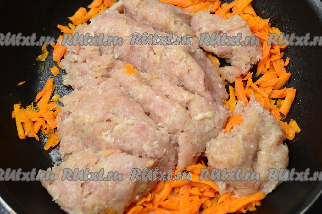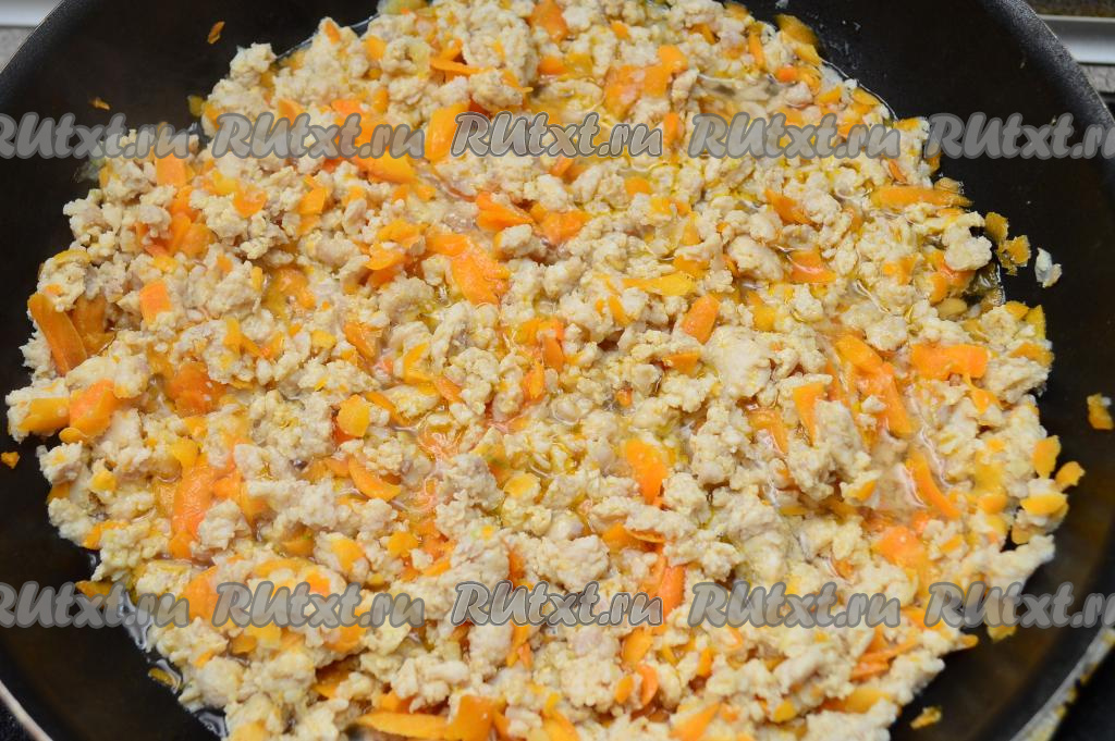 После того как морковь станет мягкой, выложить в сковороду подготовленный фарш, перемешать.