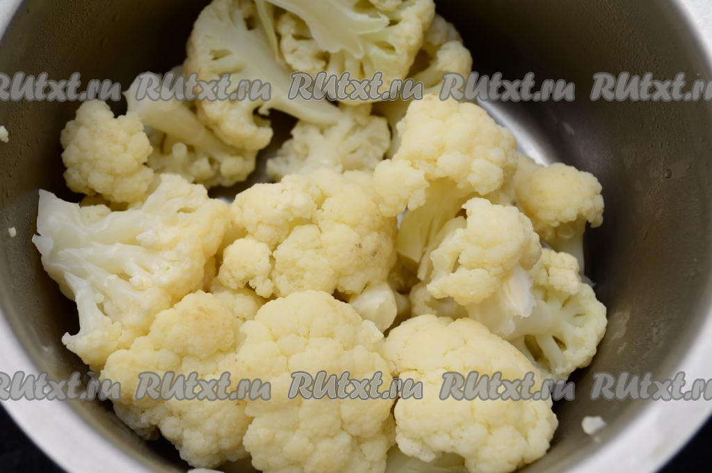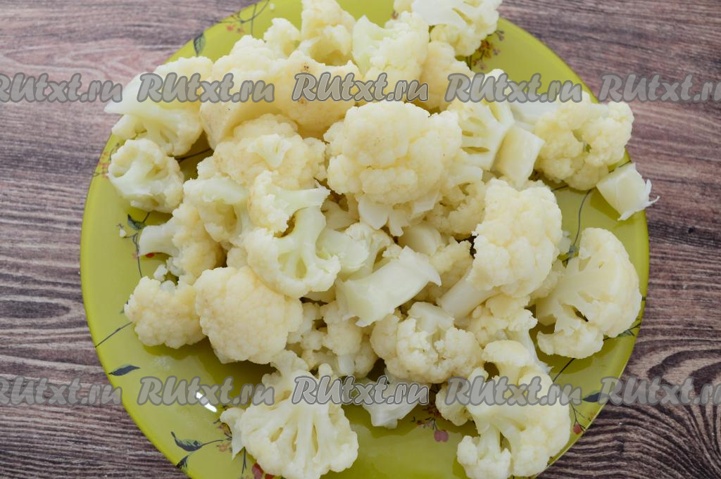 Отваренную и остывшую цветную капусту разобрать на более мелкие соцветия.