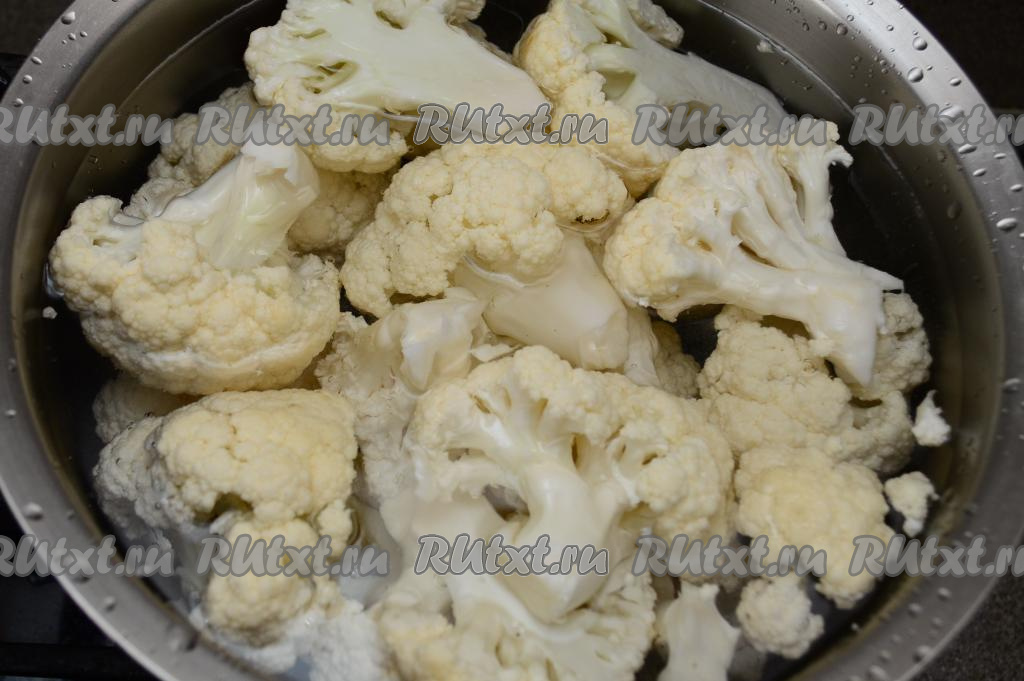 Цветную капусту промыть водой, разрезать на средние соцветия. В кастрюлю влить воду, выложить соцветия капусты, поставить на огонь. После закипания воды добавить соль, уменьшить огонь и варить цветную капусту в течение 6-8 минут. Капуста должна стать мягкой, легко прокалываться ножом, но при этом хорошо держать форму.