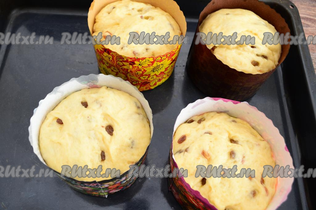 Обмять поднявшееся тесто в течение 2 минут. Разделить его на равные кусочки, сформировать каждый кусочек в шар, стараясь, чтобы практически весь изюм был закрыт тестом, и разложить по бумажным формам для куличей, заполняя формы примерно на 40%. Накрыть формы с тестом полотенцем и убрать в тёплое место на 30 минут.