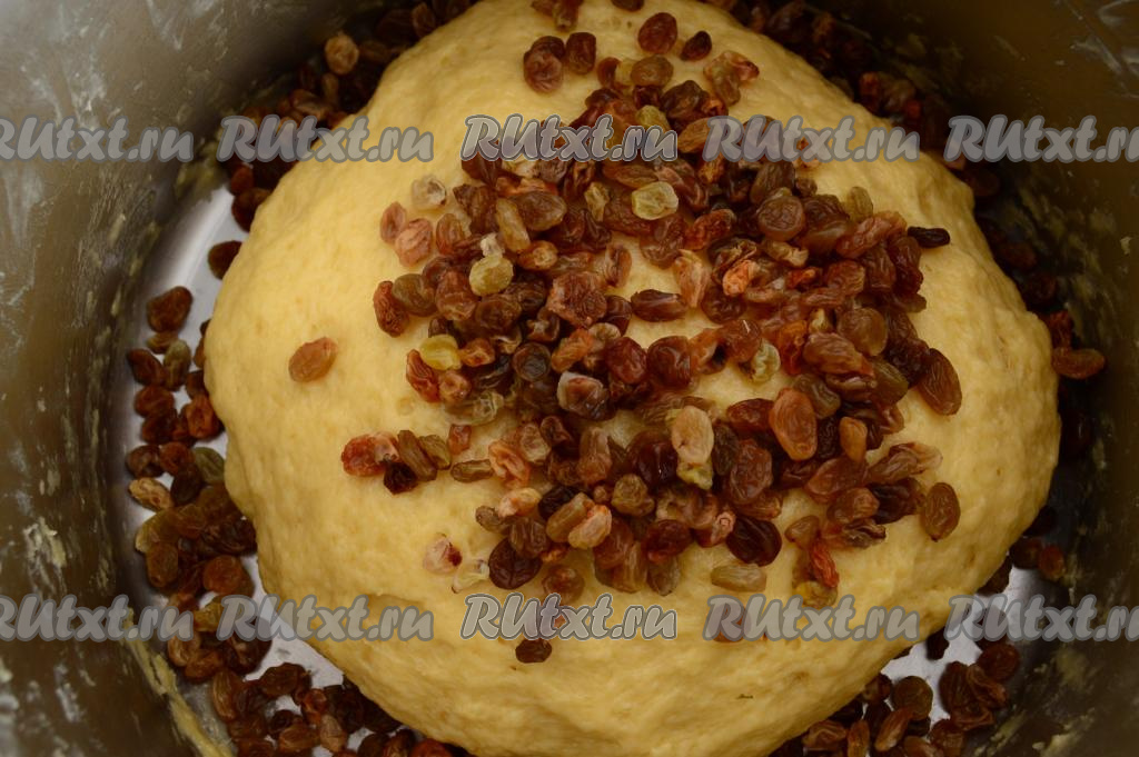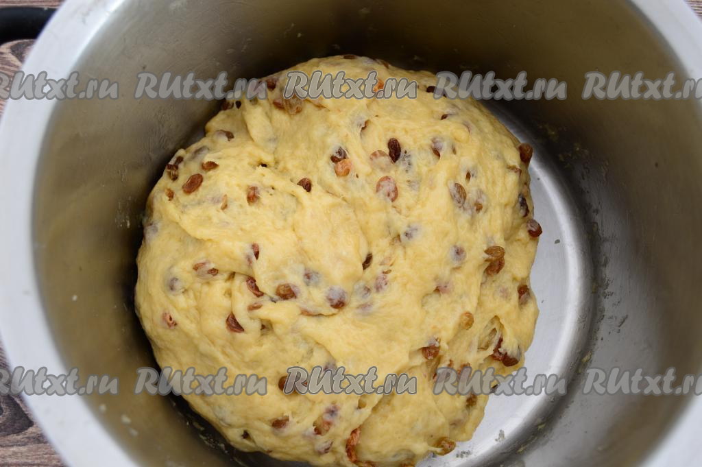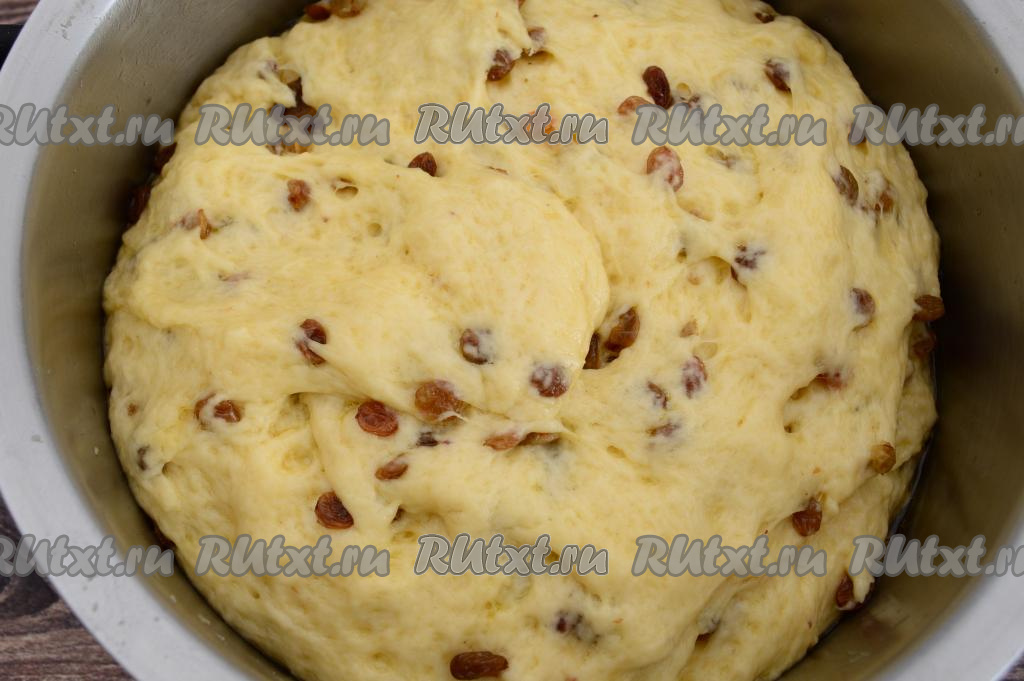 Тщательно вмешать изюм. Накрыть кастрюлю с тестом полотенцем и отправить в тёплое место на 1-1,5 часа для расстойки (до увеличения в объёме в 2,5-3 раза).