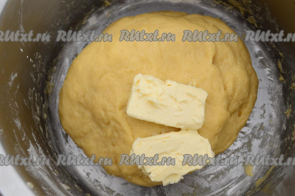В дрожжевое тесто, замешанное на сливках и желтках, добавить небольшими порциями сливочное масло комнатной температуру, каждый раз полностью вмешивая его в тесто. В процессе добавления масла тесто для куличей станет нежным, маслянистым.