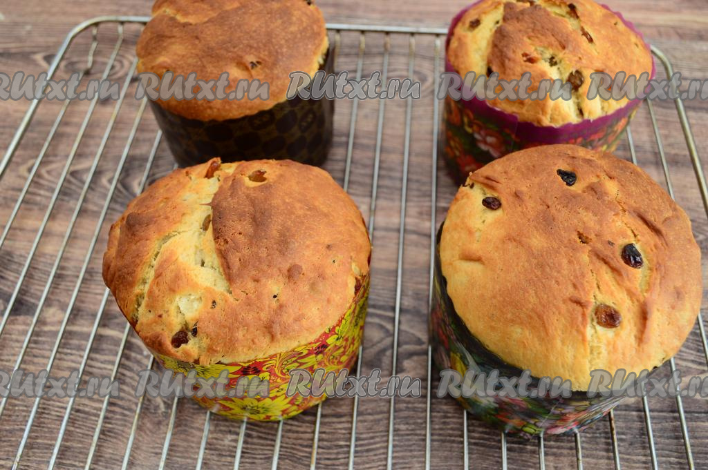 Для того чтобы проверить готовность куличей, нужно проколоть выпечку в центре до дна длинной деревянной палочкой, если после прокалывания палочка останется сухой, значит куличи готовы. Достать готовую выпечку из духовки, переставить на решётку и оставить остывать.