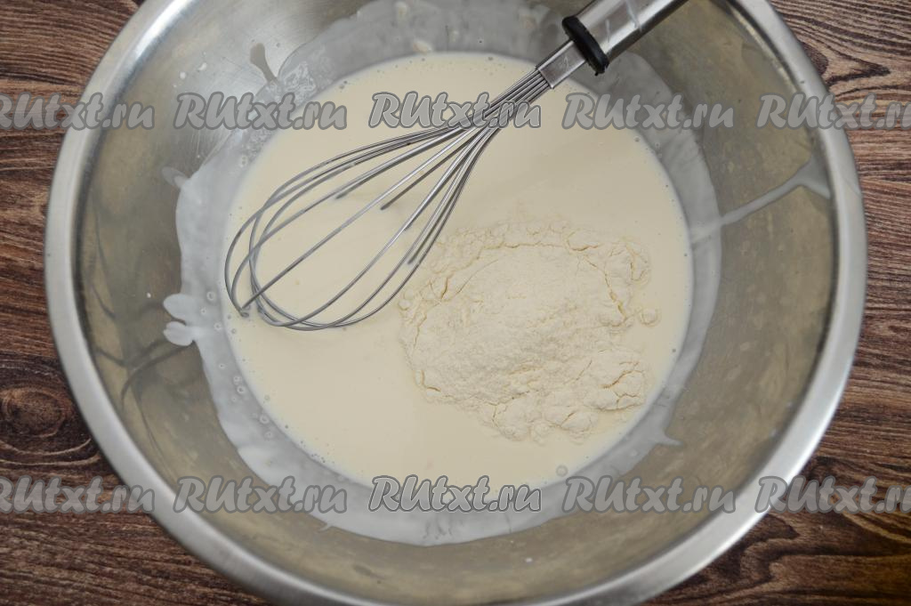 Тщательно перемешать венчиком, стараясь, чтобы живые дрожжи хорошо разошлись по сливкам. Затем всыпать 100 грамм муки от общего количества.
