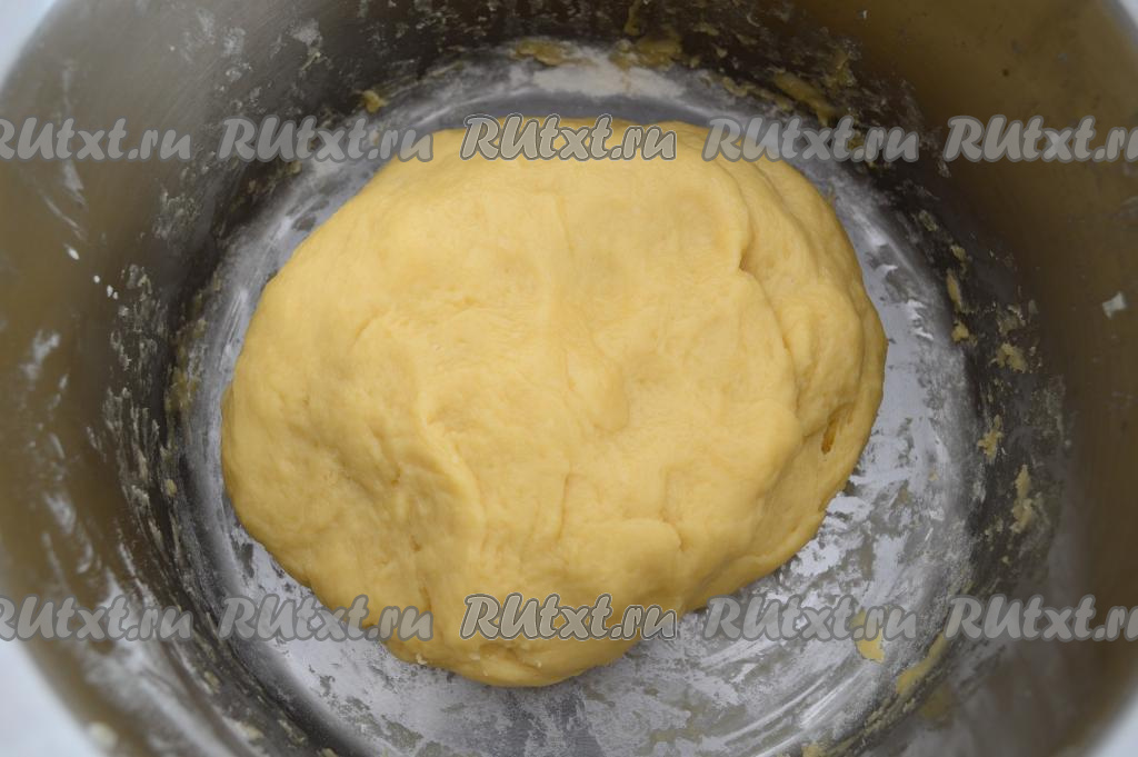 Постепенно добавляя муку и вмешивая её, замешиваем мягкое, однородное, приятное в работе, практически не липнущее к рукам тесто. Вымешиваем тесто руками не менее 8 минут.