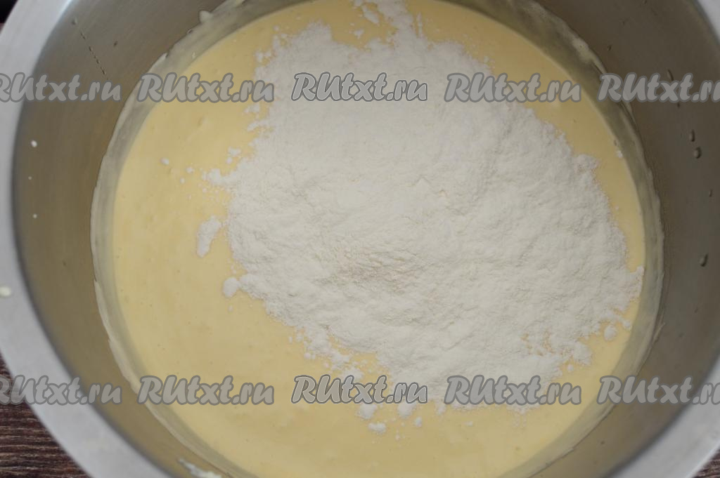 Затем перелить взбитые желтки в глубокую кастрюлю (или в миску), в которой вы будете замешивать дрожжевое тесто. К взбитым желткам выложить поднявшуюся опару.