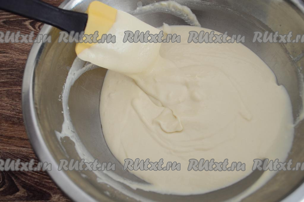 Перемешать опару и взбитые желтки лопаткой до однородности.