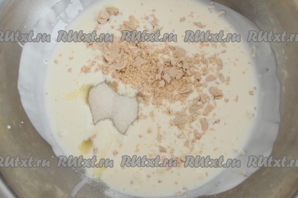 Сперва приготовим опару, для этого 350 грамм сливок нужно подогреть до 30 градусов (я подогреваю в микроволновке), влить в объёмную миску. В миску с тёплыми сливками всыпать 50 грамм сахара (сахар берётся от общего количества ингредиентов), раскрошить живые дрожжи (или всыпать сухие).