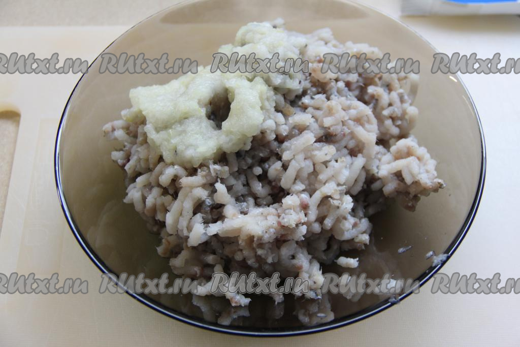 Пропустить через мясорубку филе минтая и лук в глубокую миску.