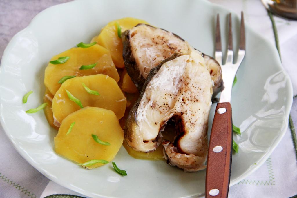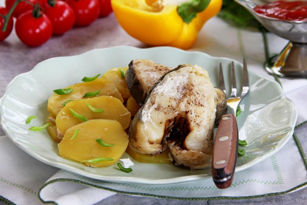 Поверх картошки выложить стейки зубатки.