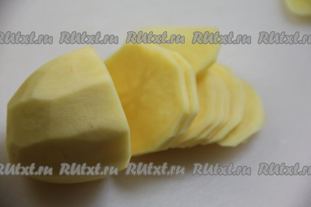 Картошку нарезать на тонкие кружочки, посолить по вкусу.
