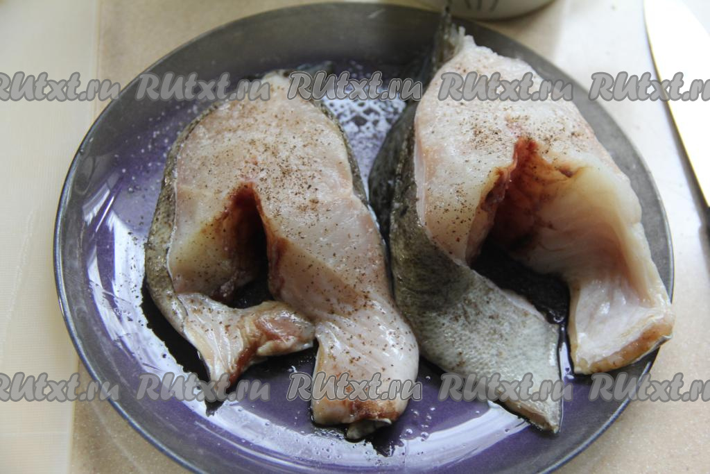 Кусочки зубатки посолить со всех сторон и приправить специями (в качестве специй я использовала чёрный молотый перец).