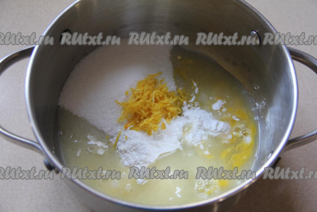 С лимона снять 1 чайную ложку цедры, стараясь не затрагивать белый слой, который расположен под жёлтой цедрой. В кастрюлю выложить сахар, крахмал, яичный желток, цедру.
