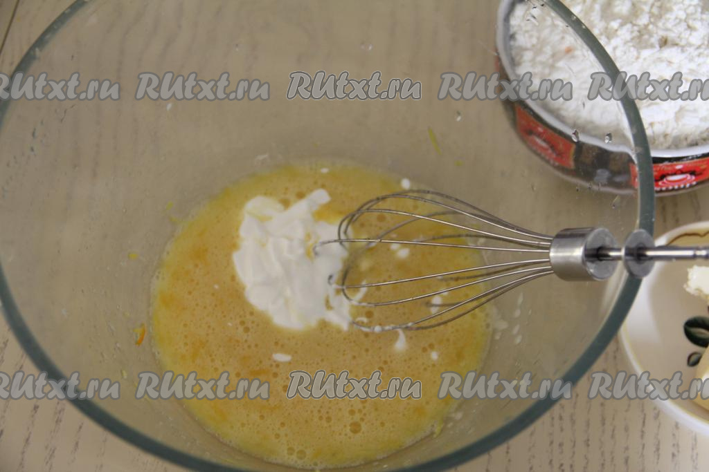Добавить в миску сметану, перемешать яично-сметанную массу.