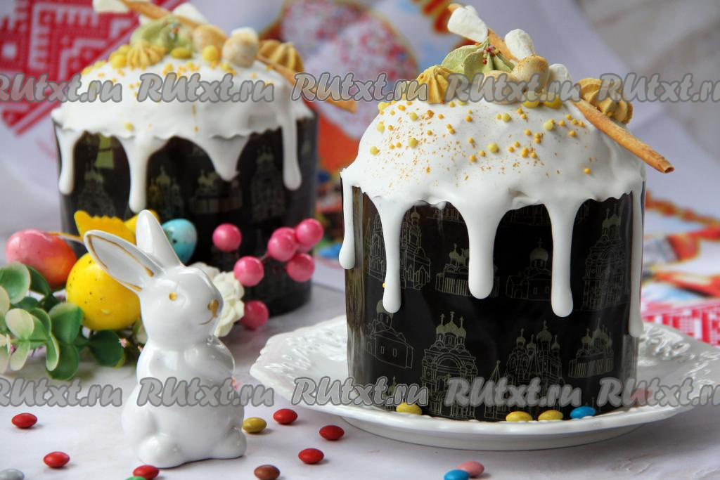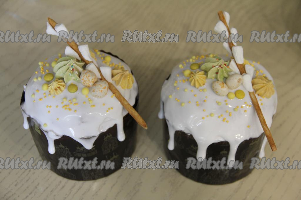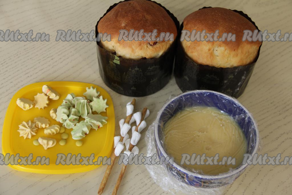 Куличи с начинкой накрыть верхушкой, срезанной ранее. Сверху покрыть куличи глазурью. Можно приготовить глазурь самостоятельно, я использовала покупную глазурь. Поверх глазури нанести пасхальный декор. Поставить куличи в холодильник, чтобы лимонный курд стабилизировался.