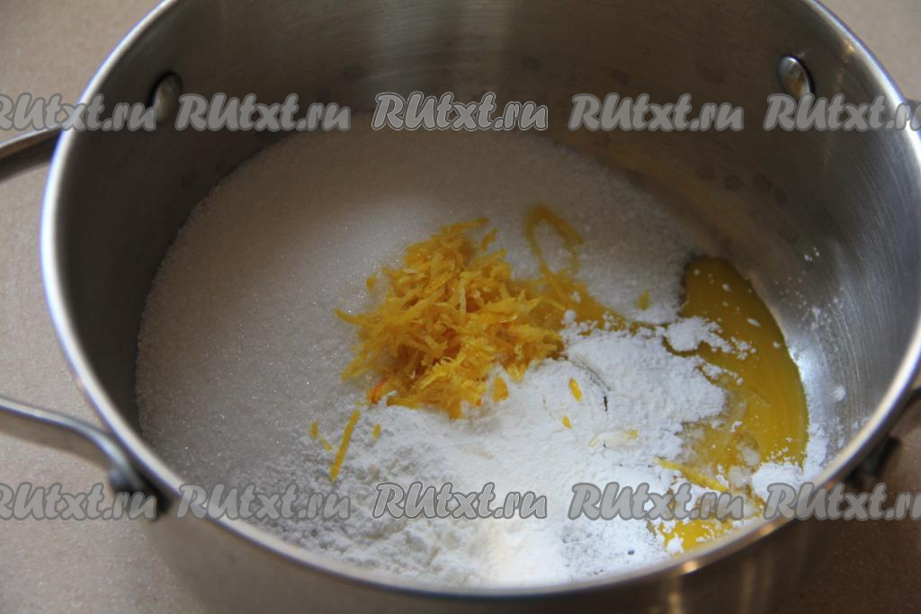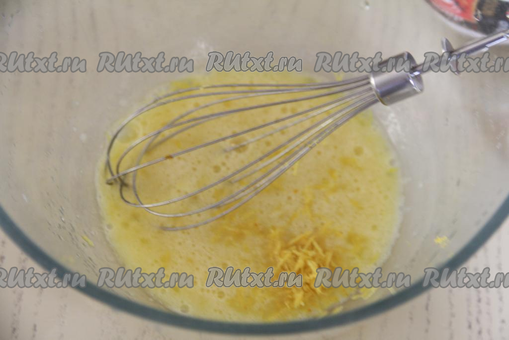 С лимона снять 1 чайную ложку цедры, не затрагивая белый слой, который расположен под жёлтой цедрой. Выложить цедру в миску со смесью яиц и сахара, перемешать венчиком.