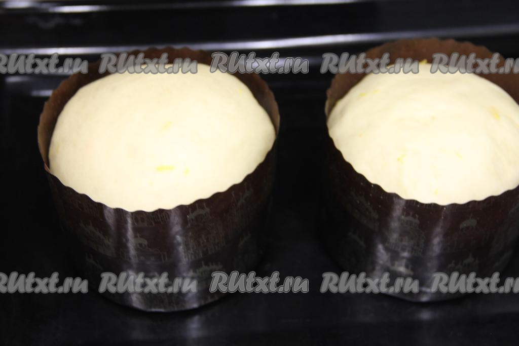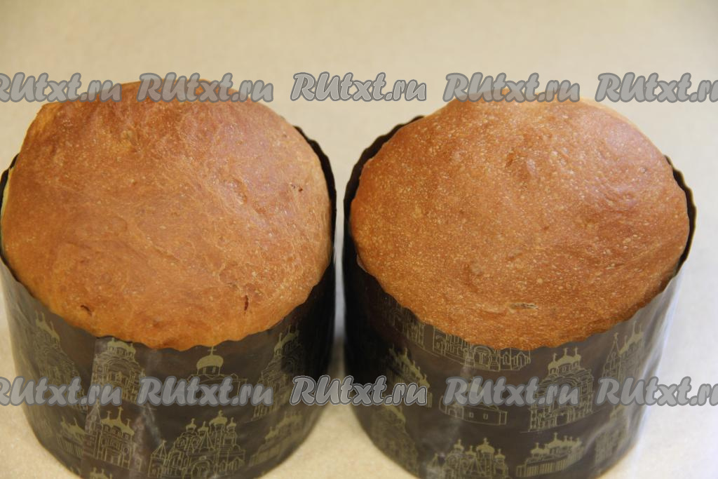 Формы с тестом отправить в духовку, разогретую до 180 градусов, выпекать куличи минут 35. Готовность проверить, проколов выпечку сухой деревянной шпажкой. Если после прокалывания куличей шпажка останется сухой, значит куличи готовы. Достать из духовки готовые куличи.