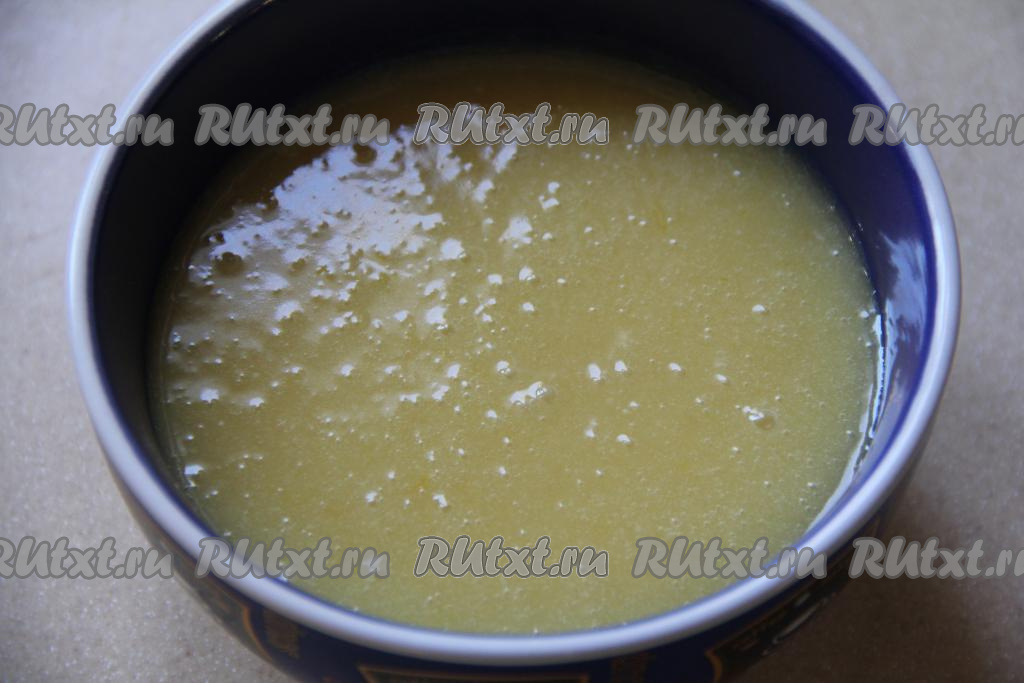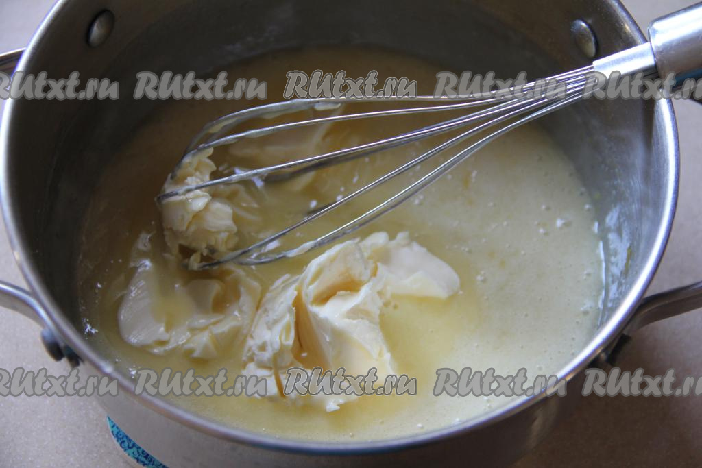 Выключить огонь, в горячий лимонный курд добавить сливочное масло комнатной температуры, перемешать венчиком до однородности.