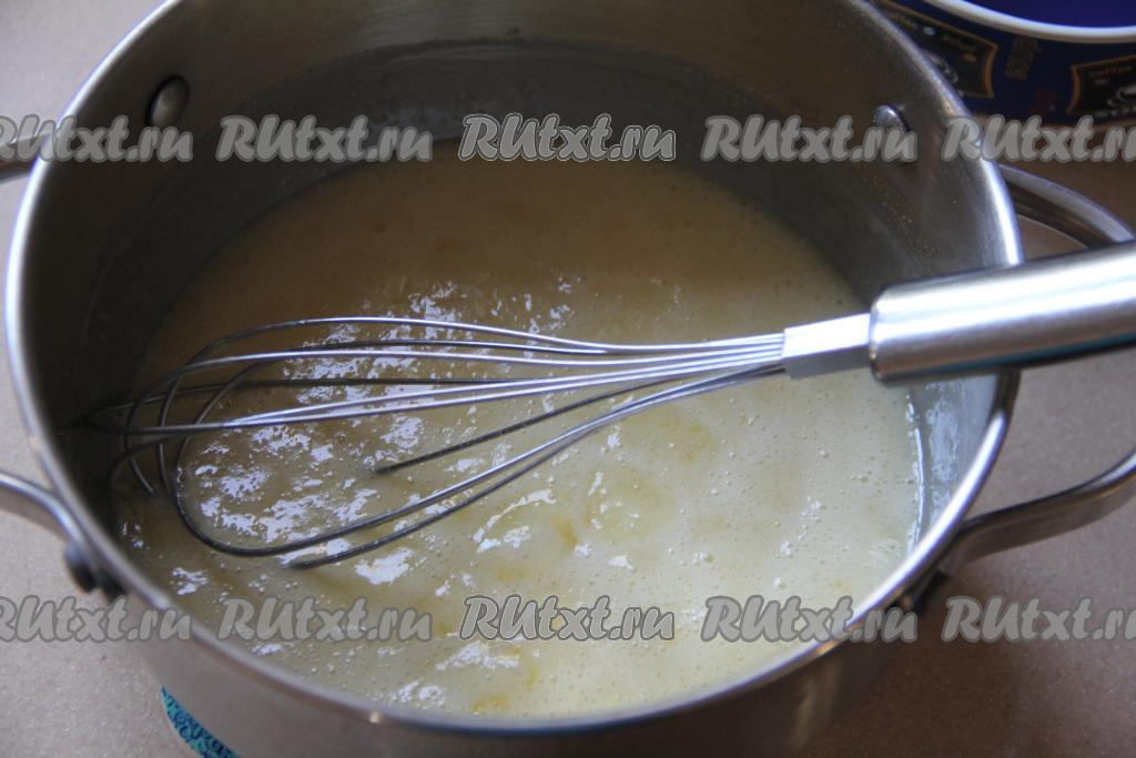 Перемешать массу венчиком и поставить кастрюлю на средний огонь.