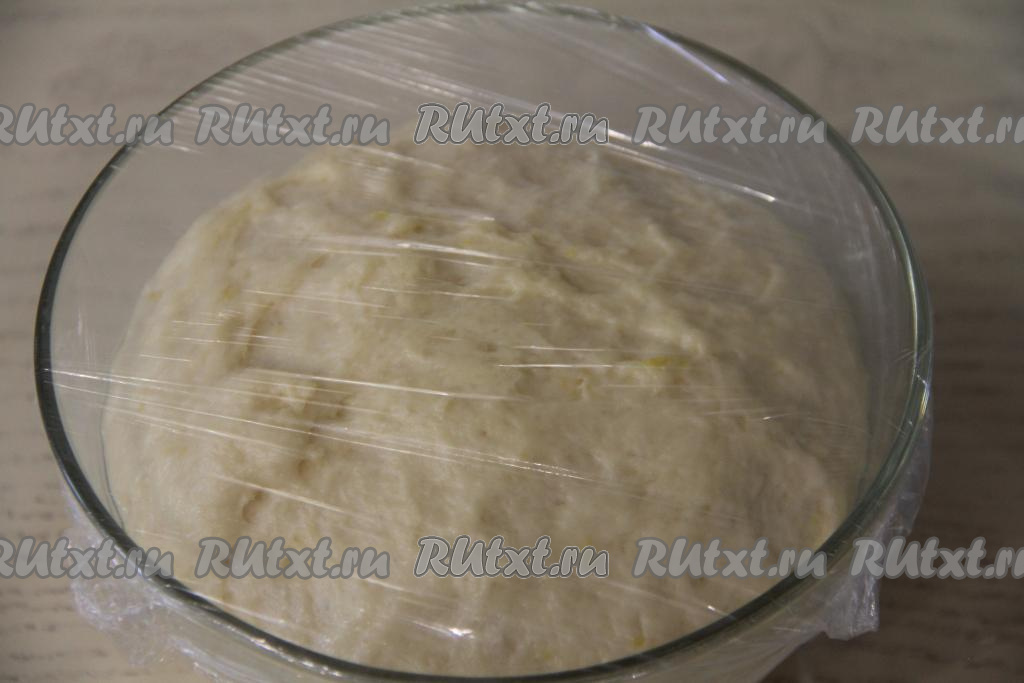 Накрыть миску с тестом пищевой плёнкой (или полотенцем), убрать в тёплое место на 1,5 часа. Тесто хорошо поднимется, увеличившись в объёме в 2-2,5 раза.