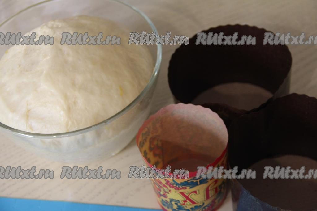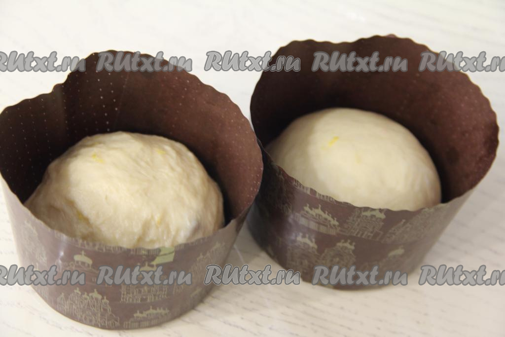 Поднявшееся тесто обмять, разделить на равные части (я разделила на 2 равные части, то есть в результате испекла 2 кулича) и, скатав каждую часть в шар, выложить в формы (я взяла бумажные формы для выпечки), заполняя их на половину объёма.